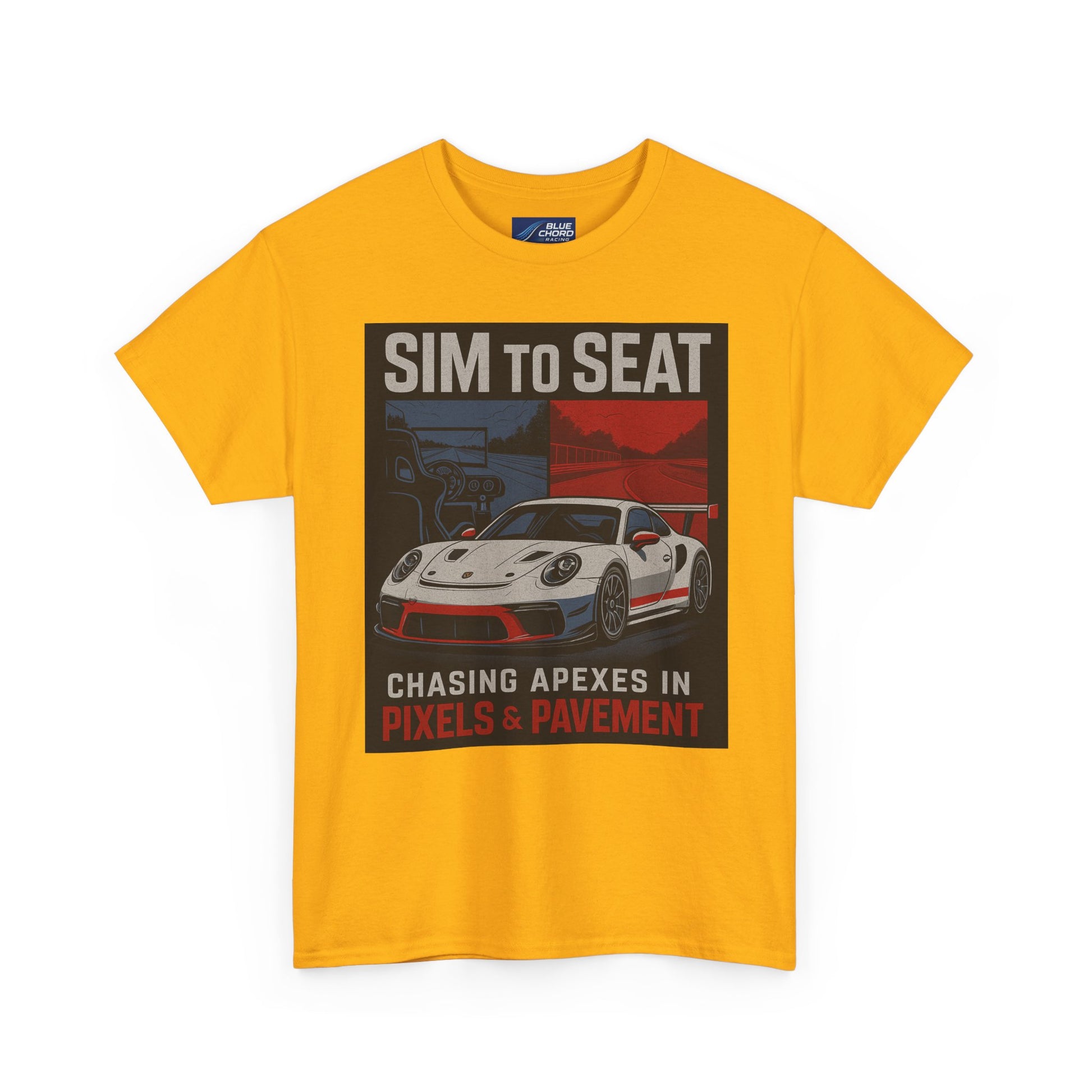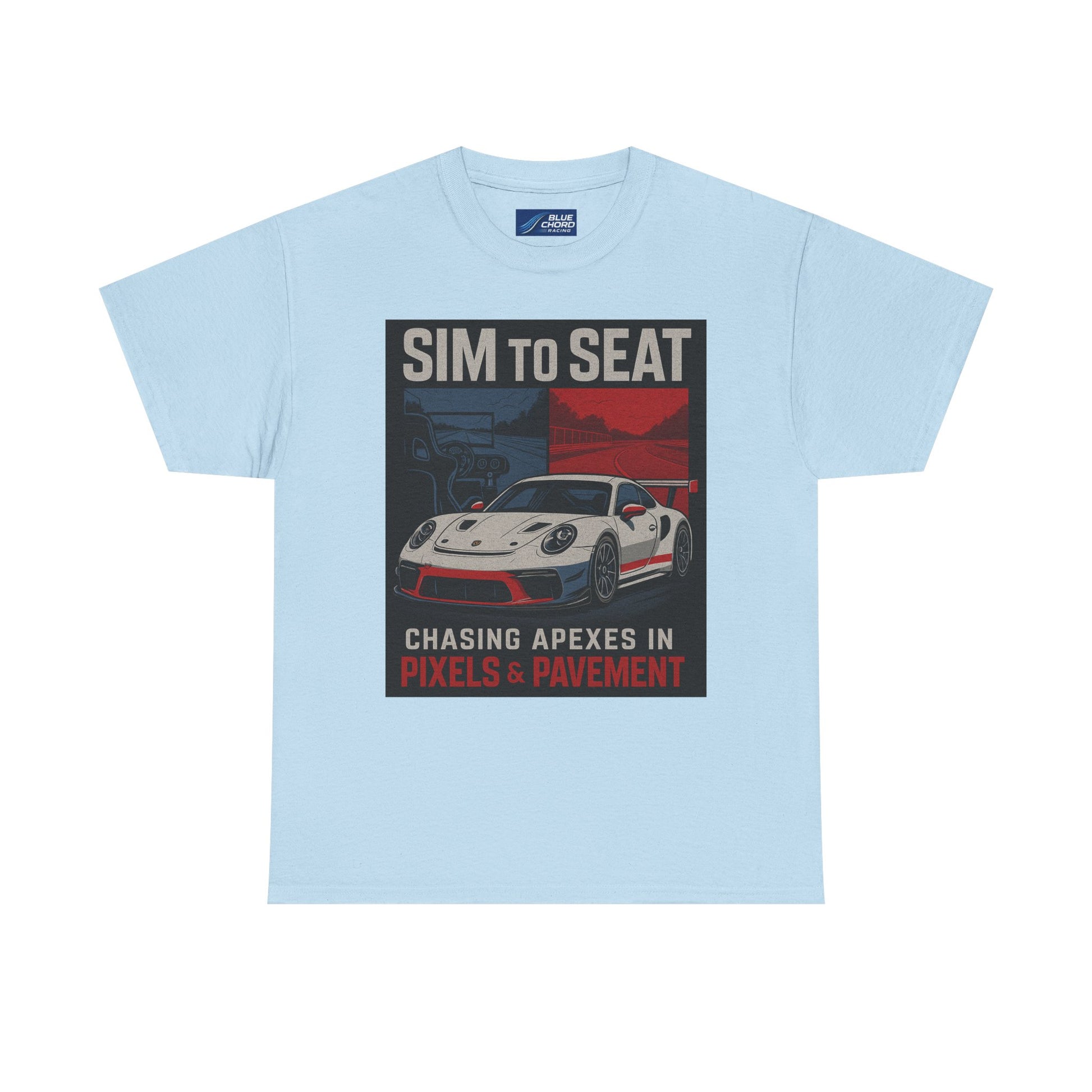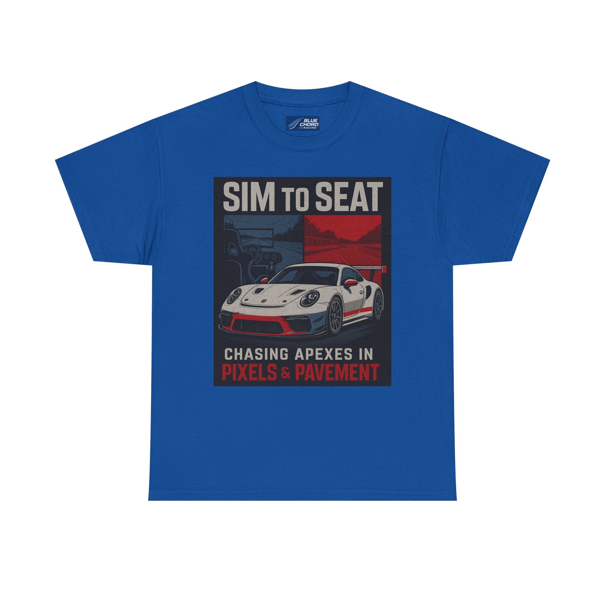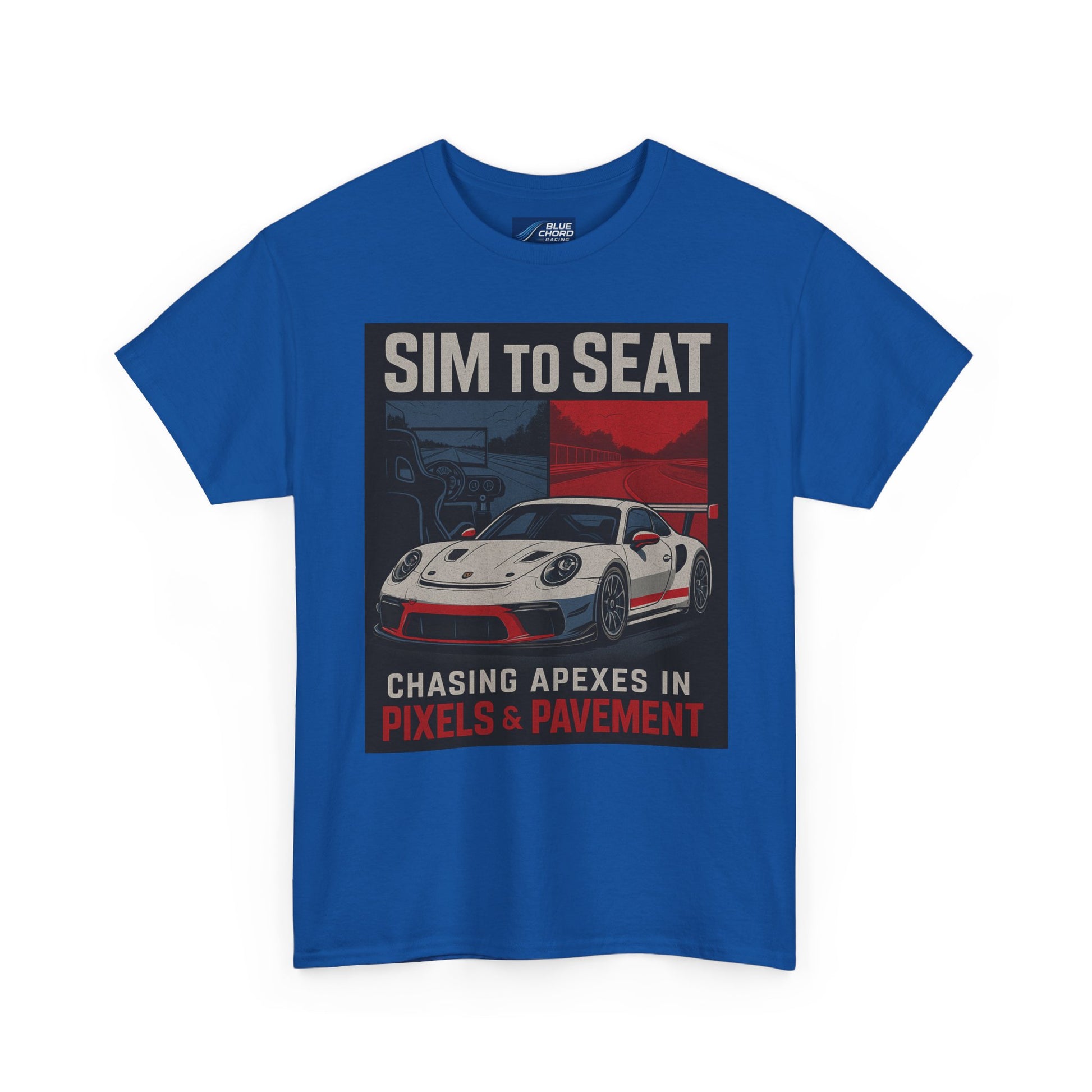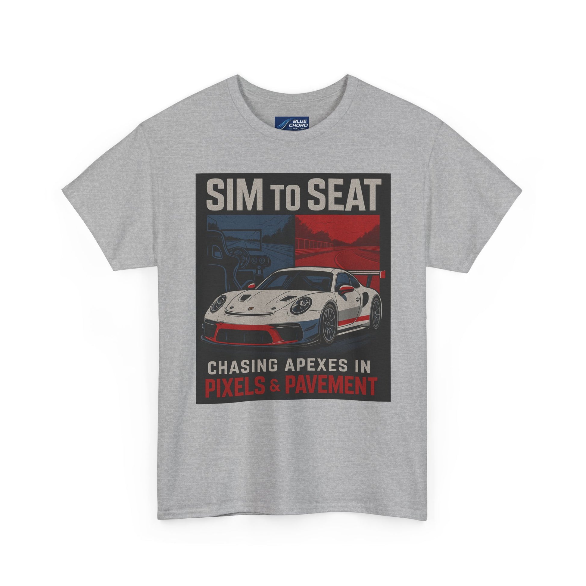 From the cockpit to the curb, this tee was built for racers who know that every apex matters — whether it's carved out on-screen or on-track. Featuring bold art of the legendary Porsche GT3R flanked by digital and asphalt worlds, this shirt captures the Sim to Seat spirit in motion: the relentless pursuit of speed, feel, and precision.
