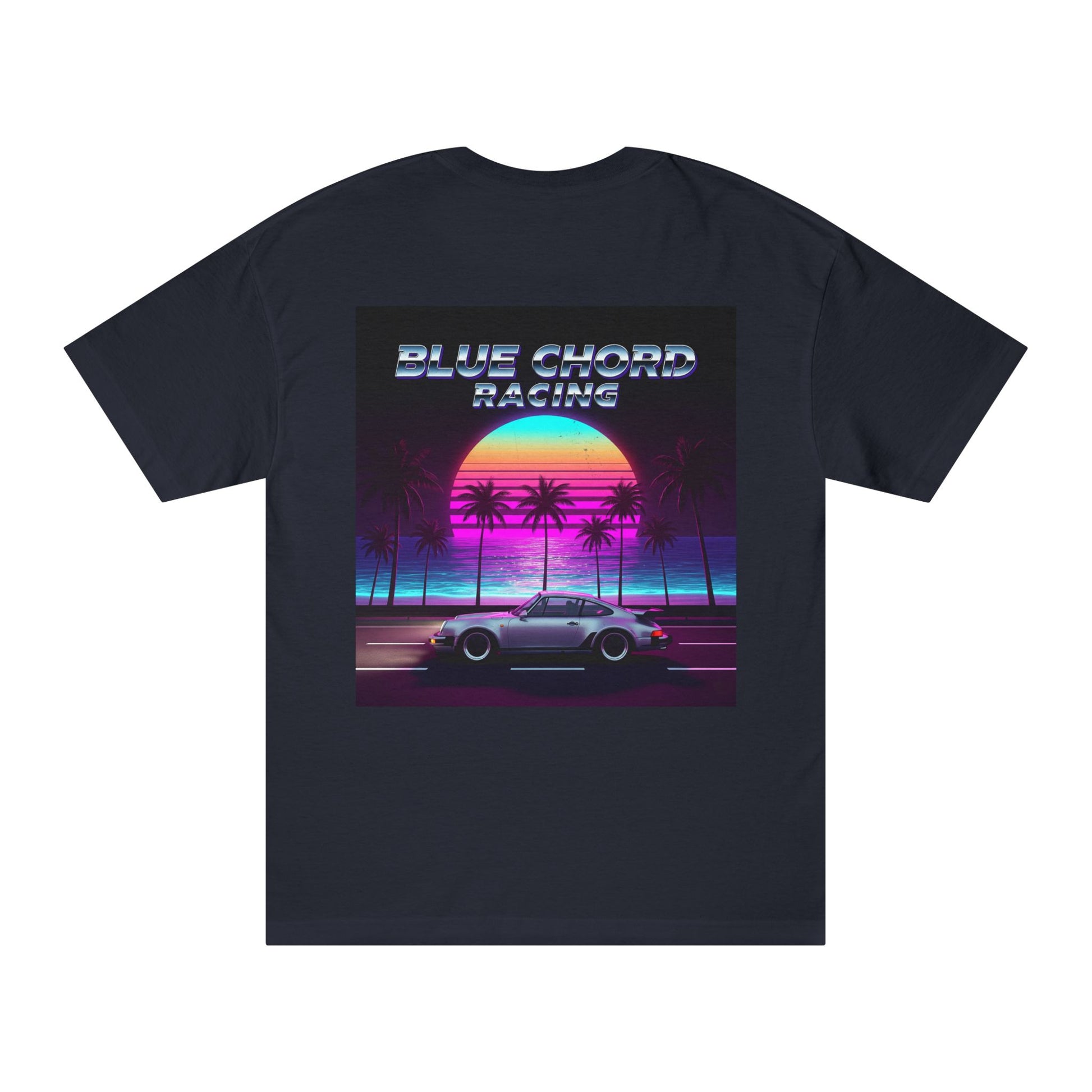 This tee pays homage to the golden era of neon lights and arcade cabinets. Featuring a synthwave-inspired graphic of the Blue Chord Porsche speeding into the digital sunset, this design captures the "Outrun" vibe that defined a generation of speed.